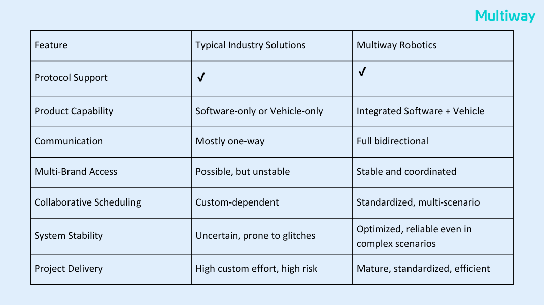 Multiway Robotics nutzt integrierte Software- und Fahrzeugfähigkeiten, um VDA5050 von einem Standard in handlungsfähige Ergebnisse umzuwandeln – und hilft Unternehmen, Automationsengpässe zu überwinden und die Logistikeffizienz zu steigern.